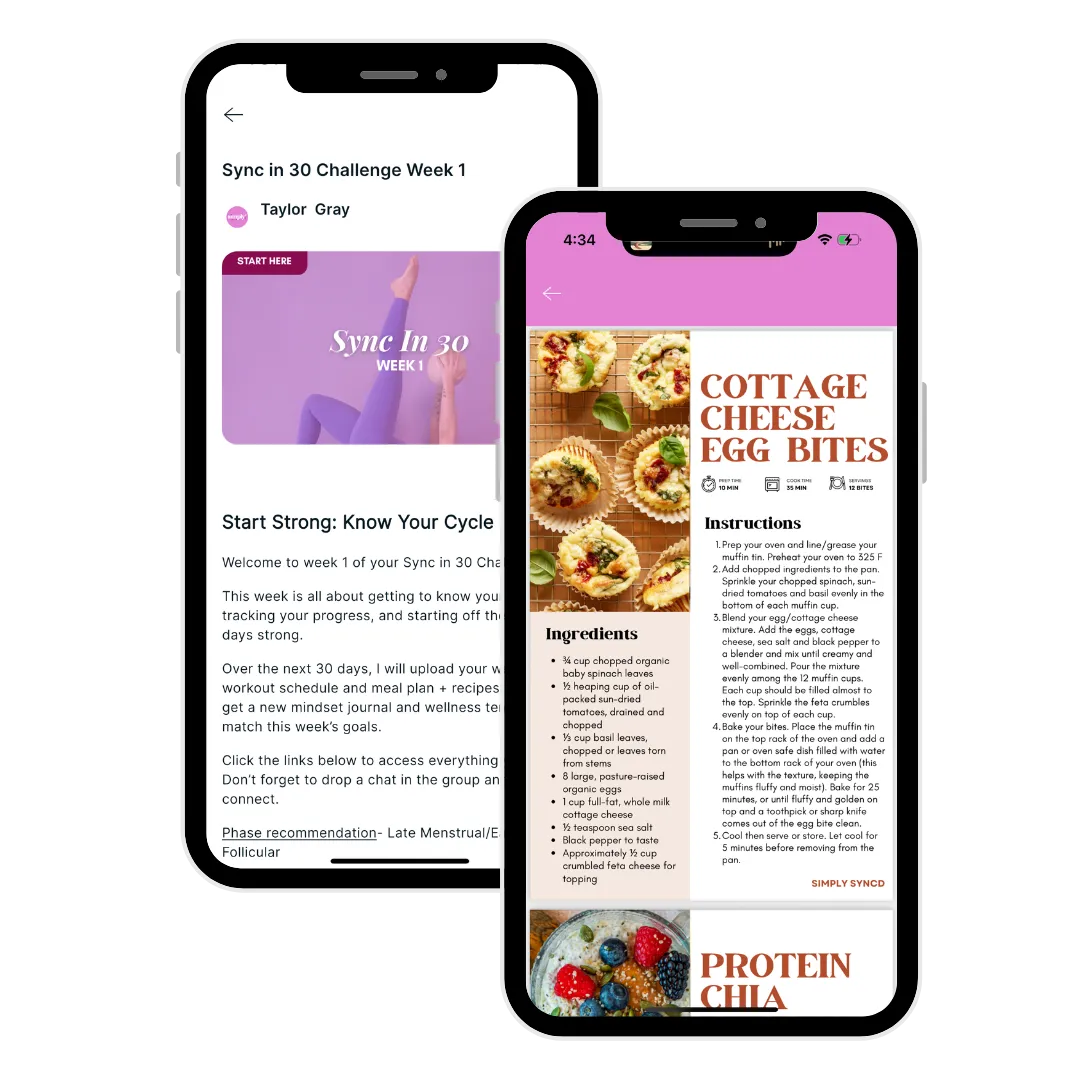 That’s exactly what I’ve built inside Simply Syncd — a proven 4-phase approach combining cycle supportive workouts, hormone loving recipes, and community guidance to help you finally feel at home in your body.
